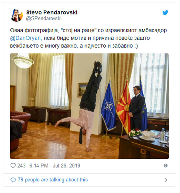 "Ova fotografija, ''stav na šake'' izraelskog ambasadora Dana Orjana neka bude motiv i razlog više zato što je vežbanje mnogo važno, a najčešće i zabavno", tvitovao je Pendarovski.