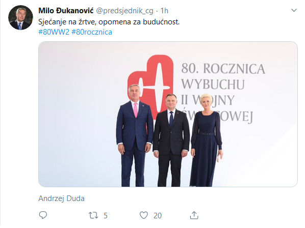 - Sećanje na žrtve, opomena za budućnost - napisao je Đukanović na svom Tviter profilu na kojem je okačio fotografiju sa Dudom.