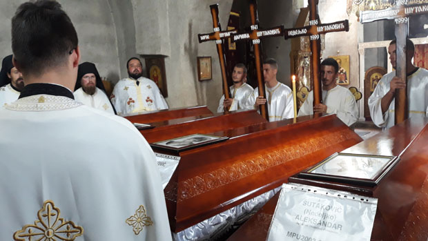 - Sahranjujemo kosti davno pobijenih sa namerom da se zatru i nikada ne nađu. Postradali na pravdi Boga, bez krivice, roditelji i maloletna deca, i to u vreme kada je "međunarodna pravda" došla na Kosmet. Eto vidimo kakva je to bila pravda...Isplivava zlo zlikovaca i pravo lice "velike Albanije". Ovo je jedno od tih lica - rekao je vladika Joanikije.