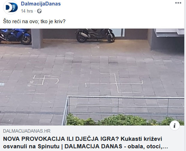 Portal je podsetio da su pre nekoliko dana na izlazu iz Splita osvanuli grafiti s porukama mržnje na nacionalnoj osnovi i rečima "Ubij Srbina", a u centru grada nedaleko od starog Hajdukovog stadiona ustaško "U", pri čemu je slovo stilizovano s krstom između.