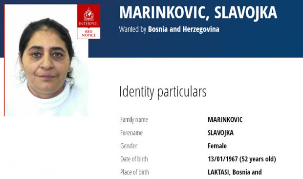 MEĐUNARODNA policijska agencija Interpol raspisala je crvenu poternicu za Slavojkom Marinković (52) iz Laktaša, koja je, zajedno sa suprugom Milenkom, osuđena za okrutno ponašanje prema Nemici Betini Signer, koja je bila zatvorena godinama na njihovom imanju u selu Karavlasi kod Kalesije.