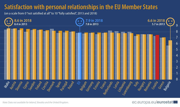 Hrvati su i tu na dnu liste. Još više nezadovoljni svojim ličnim odnosima su samo Bugari (6,6) i Grci (7,1), dok su Hrvati s ocenom 7,5 treći u EU.