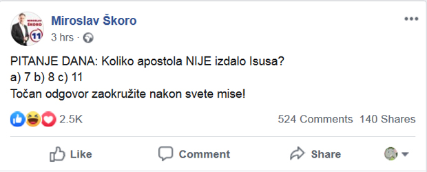 Nakon što je, naime, Miroslav Škoro objavio "pitanje dana" o Isusovim apostolima čiji odgovor daje njegov redni broj na glasačkom listiću, izbornu je tišinu, doduše manje eksplicitno, prekršio i Milanović, navodi portal.