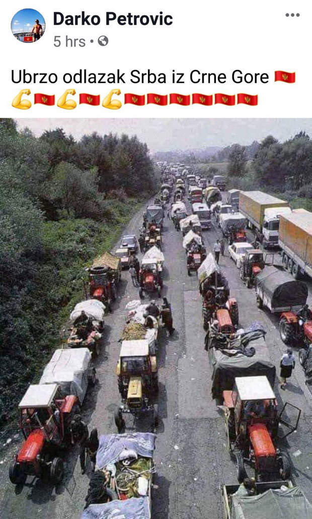 Darko Petrović iz Podgorice na svom Fejsbuk profilu stavio je fotografiju traktora uz komentar: Ubrzo odlazak Srba iz Crne Gore