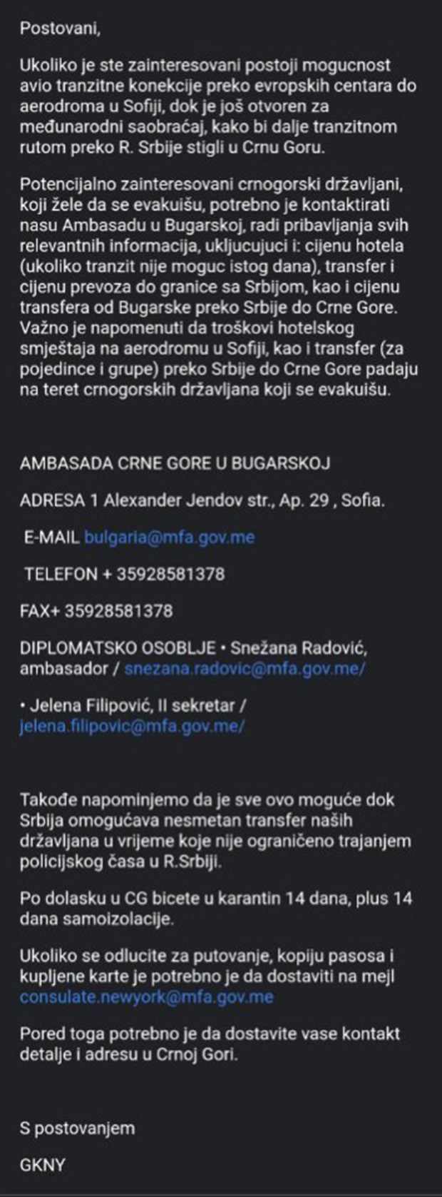 - U mejlu koji Demokrate stavljaju na uvid javnosti, a koji je poslat jednom broju naših državljana u Americi, Konzulat Crne Gore u Njujorku je naše građane obavestio o mogućem povratku u Crnu Goru, ukoliko poseduju karte, ali samo do Bugarske. Ono što je porazno u svemu ovome, a što do kraja otkriva slabosti poharane države, jeste činjenica da se građani usled pandemije korona virusa, u svoju državu mogu vratiti samo i isključivo o svom trošku, što se jasno navodi u pomenutom mejlu - navodi se u saopštenju, postavljajući pitanje zašto se „Montenegro erlajns“ kome je isplaćeno 155 miliona evra, ne angažuje u "spašavanju naših građana širom sveta".