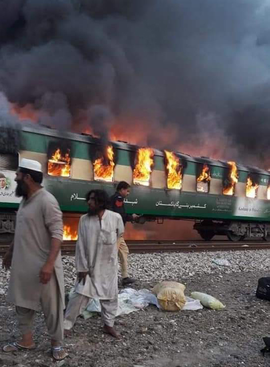 Very sad news The fast-moving train from Karachi to Rawalpindi was set ablaze near Liaquatpur station at 6am this morning. Many people are reported dead and injured. pic.twitter.com/pCNILc8Xco