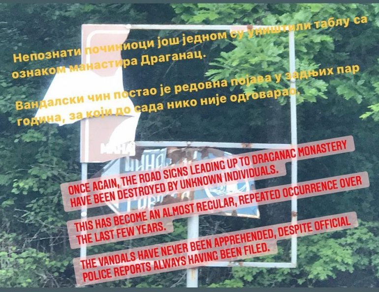 NEPOZNATI počinioci još jednom su uništili tablu sa oznakom manastira Draganac koja je putokaz do ove svetinje u opštini Novo brdo na Kosovu i Metohiji.