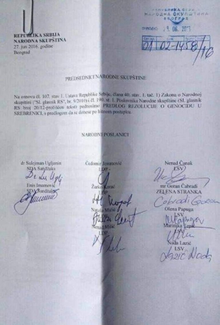 Podsećamo, lider SDA Sandžaka Sulejman Ugljanin, lider LSV Nenad Čanak i Marinika Tepić sada potpredsednica stranke Dragana Đilasa, potpisali su rezoluciju kojom se priznaje tzv. genocid u Srebrenici.