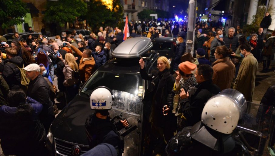 Iza neprijavljenog protesta stoji NVO "Inicijativa mladih za ljudska prava", a među okupljenima je uočen Aris Movsesijen iz Nove stranke, kao i Dobrica Veselinović - Ne davimo Beograd.