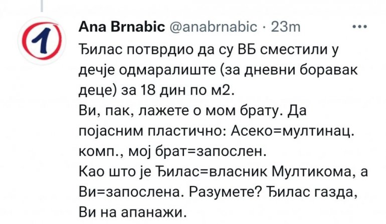 Brnabićeva je napisala da je Đilas potvrdio da su VB smestili u dečije odmaralište (za dnevni boravak dece) za 18 dinara po metru kvadratnom.