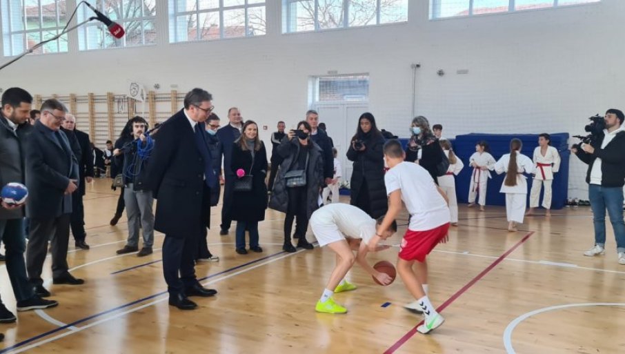 Vučić je sa ministrom omladine i sporta Vanjom Udovičićem i ministrom poljoprivrede Branislavom Nedimovićem otvorio novoizgrađenu halu za fizičko u školi koju pohađa 222 učenika.