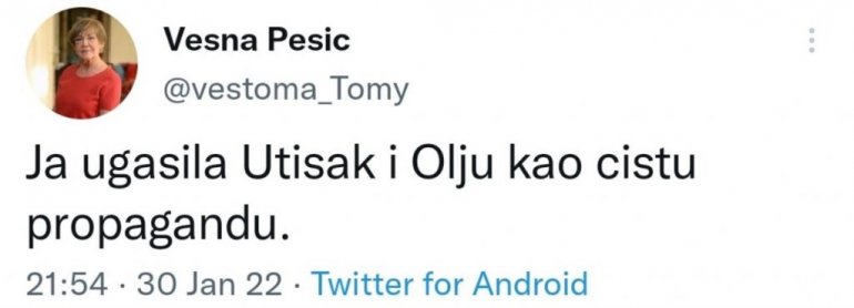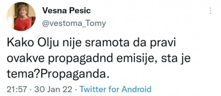 - Kako Olju nije sramota da pravi ovakve propagandne emisije? Ugasila sam Utisak - napisala je Pešić na Tviteru.