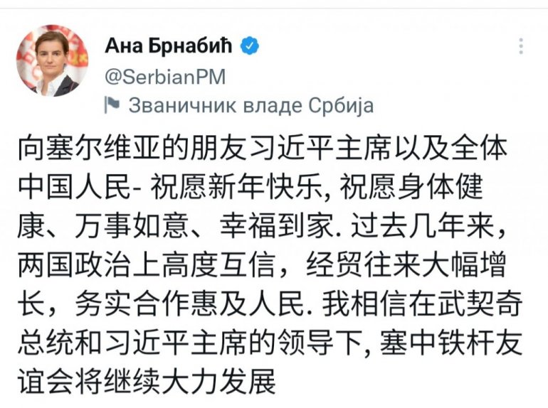 - Tekst koji je Brnabićeva napisala je baš u duhu kineskog jezika i sasvim je ispravno napisana. Ljudi moraju da znaju da je automatsko prevođenje putem alata na internetu pogrešno i da se tamo dešavaju greške, ali ova čestitka je napisana pravilno. Mi smo zadovoljni i zahvalni na iskrenim čestitkama, to je gest prijateljstva naših naroda - rečeno nam je iz ambasade.