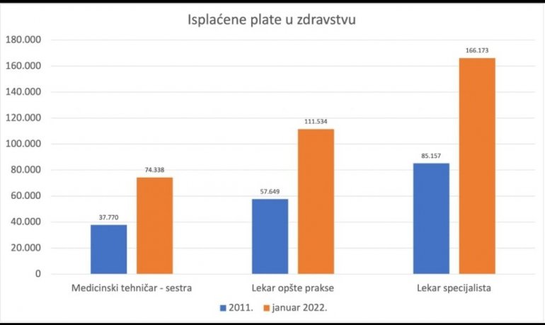 Plate lekara opšte prakse su pre jedanaest godina bile 57.649 dinara, dok danas oni primaju 111.534 dinara. Lekari specijalisti su 2011. godine imali platu u iznosu od 85.157 dinara, dok je njihova plata danas 166.173 dinara.