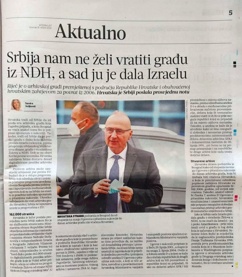 To je odmah aktiviralo alarme u Zagrebu. Našem Ministarstvu spoljnih poslova upućena je nota sa zahtevom da im Beograd "preda svu arhivsku građu, kako je dogovoreno sukcesijom", kao i da im se dostavi kopija dokumenata koji su predati Izraelu.