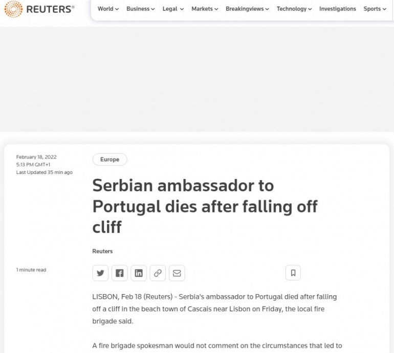O SMRTI ambasadora Srbije u Portugaliji izvestila je i britanska agencija Rojters koja navodi, pozivajući se na lokalnu vatrogasnu brigadu, da je ambasador poginuo nakon što je pao s litice u gradu Kaškaišu u blizini Lisabona.
