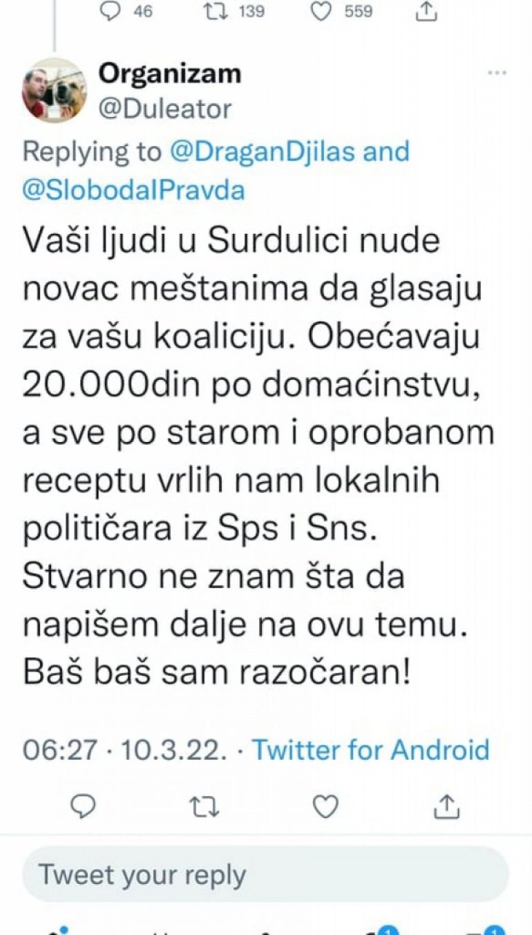 20.000 DINARA ZA GLASANJE: Optužbe na tviteru