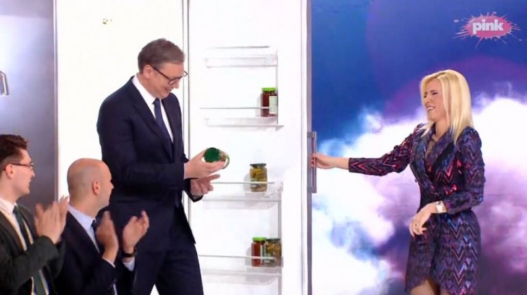 Vučić se u emisiju uključio tako što je prošao kroz vrata koja predstavljaju prava vrata frižidera.
