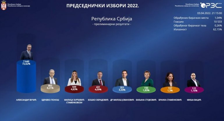 Prema prvim rezultatima na predsednickim izborima Aleksadar Vučić je osvojio 72 glasa, 55,38%, a Zdravko Ponoš 43 (33,06%).