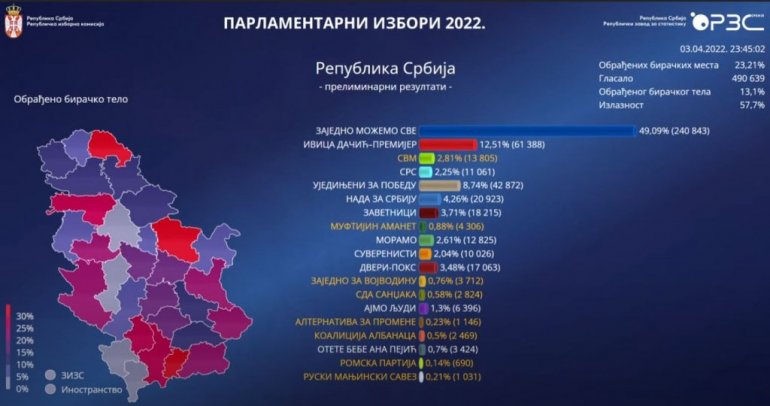 Iz štaba Srpske napredne stranke objavljeni su prvi preliminarni rezultati izbora u Srbiji, a na osnovu obrađenog uzorka.