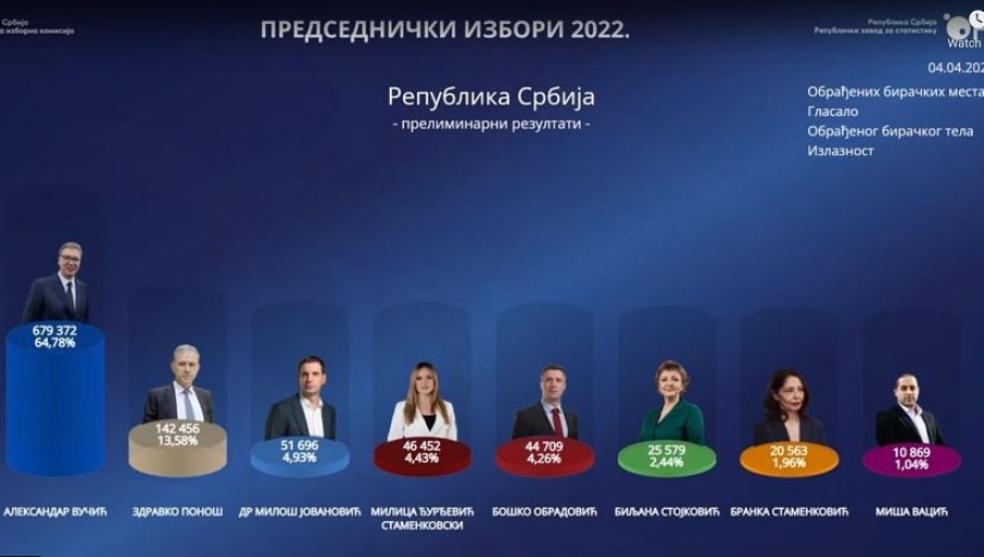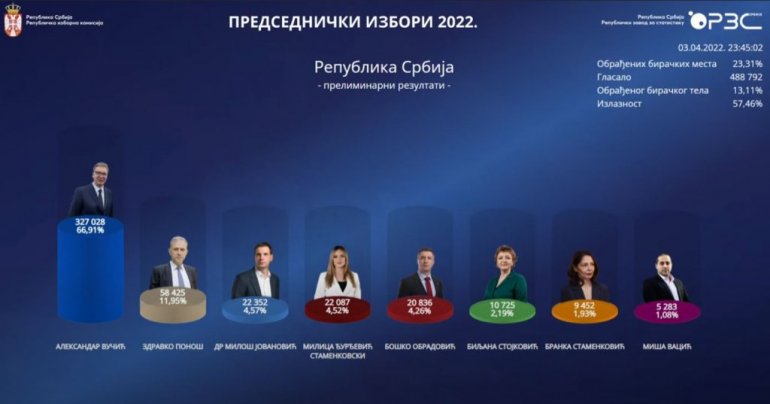 RIK na 3,75 odsto obrađenih biračkih mesta: Vučić 71%, Ponoš 8,8 %