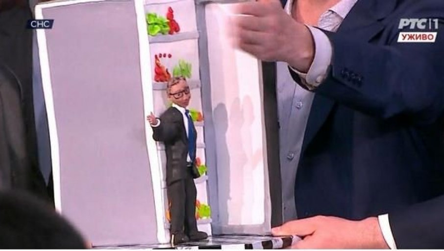Na binu je izneta torta, ali ne bilo kakva. Poslastica je napravljena u obliku frižidera, sa figurom muškarca koja podseća upravo na Vučića.