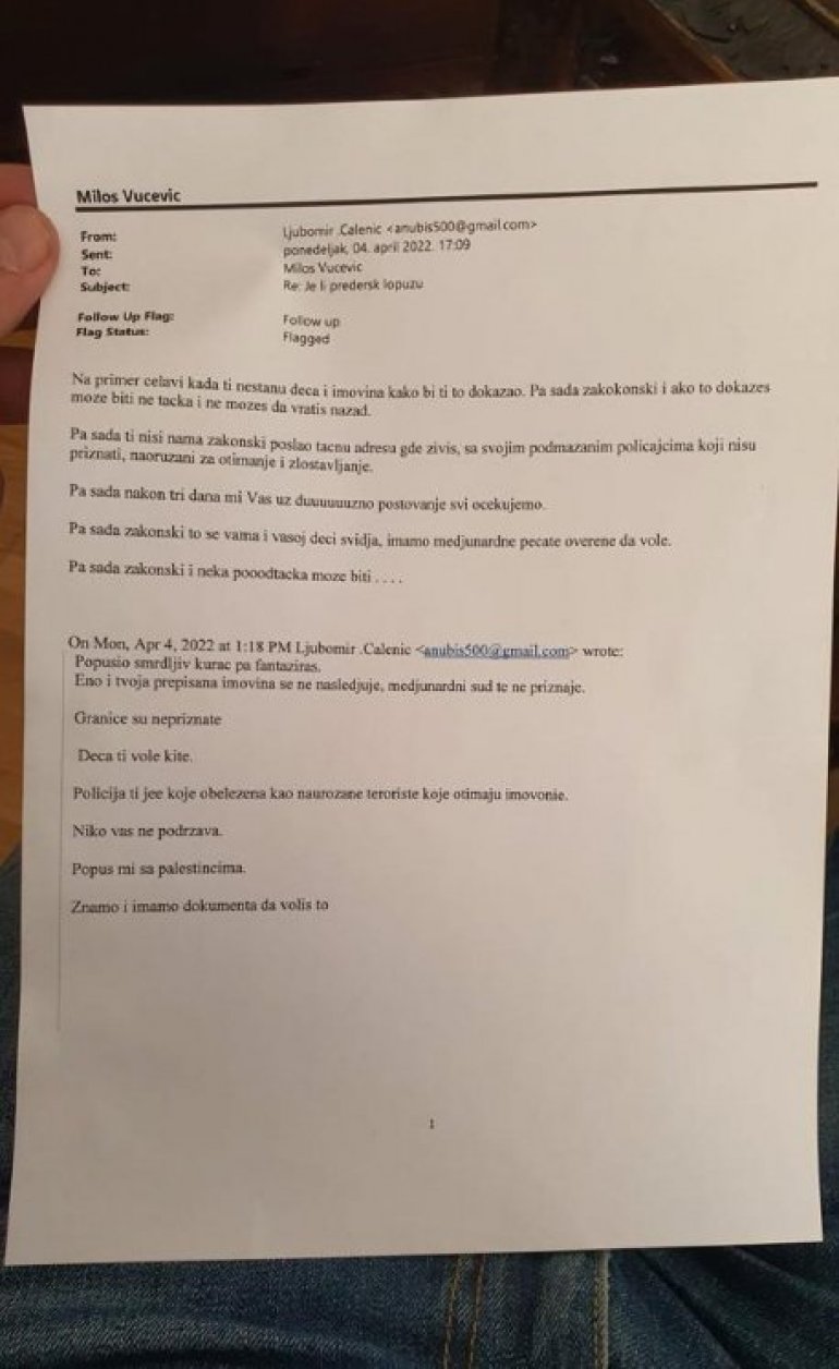 U poruci Milošu Vučeviću i njegovoj porodici preti se smrću.