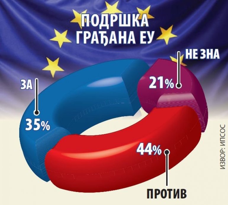 PREMA poslednjem istraživanju Agencije Ipsos, podrška građana evropskim integracijama nikada nije bila manja, pa se tako za EU izjasnilo 35 odsto ispitanika, 44 je protiv, dok 21 odsto ne zna ili ne želi da se izjasni.