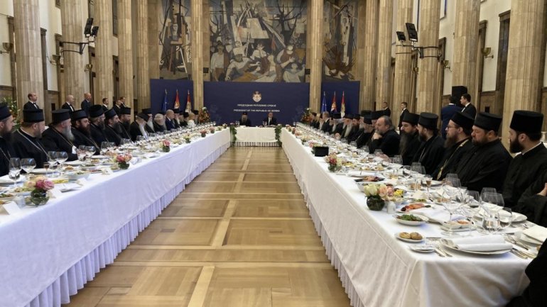 - O svim odlukama ćemo vas obavestiti. Radićemo sve da odluke koje budemo donosili donosimo u skladu sa interesima Srbije i građana, čuvaćemo mir, ali i sopstvene moralne vrednosti. Moja molba za vas, jer svuda gde ima crkve ima i naroda..., da nam pomognete da svi razumeju poziciju Srbije i da svi budemo jedinstveni - istakao je predsednik.