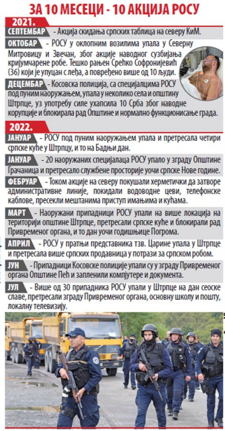 Najpre su na Vidovdan sproveli niz antisrpskih akcija, hapsili one koji su nosili srpska obeležja i zabranjivali ulazak zvaničnika iz Beograda na KiM, a juče su na meti bili Srbi u Štrpcu. Tamo su pripadnici ROSU raspoređeni na više lokacija, blokirali čitavu opštinu, upali u osnovnu školu "Šarski odred" na Brezovici, u objekat pošte u selu Drajkovce, upali i pretresali zgradu Privremenog organa odakle su izneli svu dokumentaciju i kompjutere, upali su u zgradu TV Herc, jedine televizije na srpskom jeziku u ovom mestu, a sa bandera su skidali nadzorne kamere koje ne rade više godina.