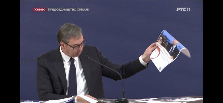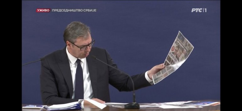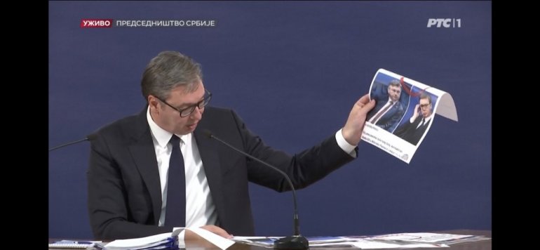 - Primetili ste da prvi put ova informacija se nije pojavila u srpskim medijima, to govorim zbog onih koji su prethodnih dana govorili kako sam pravio cirkus i "predstavu"; tatu informaciju obhjavio je Jutarnji list u 7 i 29. To se dešava zato što su oni mislili da ćemo mi izaći u javnost, iako smo mi želeli da notu predamo u tišini, već je bio zakazan razgovor. Zato su krenuli u napad sa sumanutim argumentima "Vučić je hteo da dođe na našu teritoriju da upali sveću i položi sveće. Zamislite taj haos koji to može da izazove polaganjem sveća - možda što bi moja traka bila crveno-plavo-bele boje, u skladu sa stradalnim narodom. To nisam mogao ni da zamislim. Isti naslov je išao u svim medijima - navodi Vučić.
