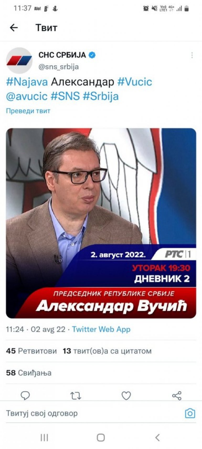 VUČIĆ GOST DNEVNIKA: Predsednik večeras na RTS-u