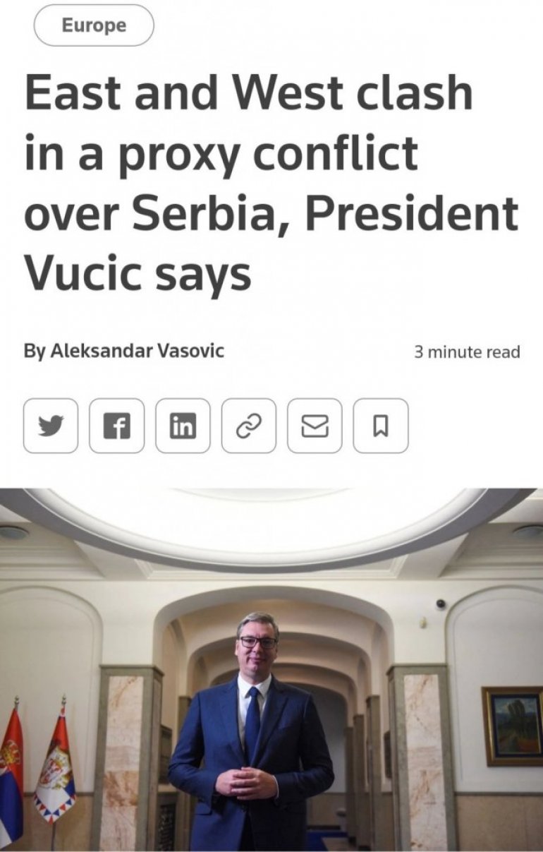 SRBIJA je pozornica za posrednički rat između Istoka i Zapada, izjavio je za Rojters predsednik Srbije Aleksandar Vučić.