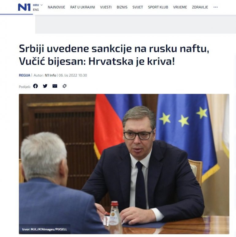 NA portalu Hrvatskog N1 objavljena je potpuna neistina da je predsednik Srbije Aleksandar Vučić izgovorio rečenicu "Hrvatska je kriva" povodom novog paketa sankcija Rusiji, a kojim je na insistiranje Hrvatske obuhvaćena Srbija, čime nam je onemogućen uvoz ruske nafte preko Janafa.