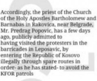 - U vezi sa zahtevom za posetu patrijarha Srpske pravoslavne crkve Republici Kosovo, najavljenu za 26-28. decembar 2022. godine, obaveštavamo da je Vlada Republike Kosovo svesna da su članovi Srpske pravoslavne crkve poslednjih dana aktivno uključeni u pružanje podrške kriminalnim grupama koje održavaju barikade na severu Republike Kosovo već više od 16 dana. Shodno tome, sveštenik hrama Svetih apostola Vartolomeja i Varnave u Rakovici kod Beograda, gospodin Predrag Popović, pre nekoliko dana je javno priznao da je ulaskom u tzv. Republiku Kosovo posetio demonstrante na barikadama u Leposaviću, ilegalno, alternativnim putevima, kako bi – kako je naveo – izbegao patrole KFOR-a - stoji u pismu Prištine.