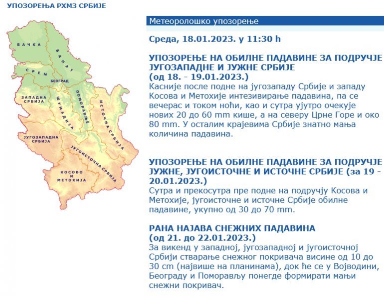U petak i subotu u brdsko-planinskim predelima južnije od Save i Dunava doći će do stvaranja i povećanje visine snežnog pokrivača za 10 do 30 cm, naročito u planinskim predelima, dok će se u delovima Vojvodine, u Beogradu i Pomoravlju formirati manji snežni pokrivač.