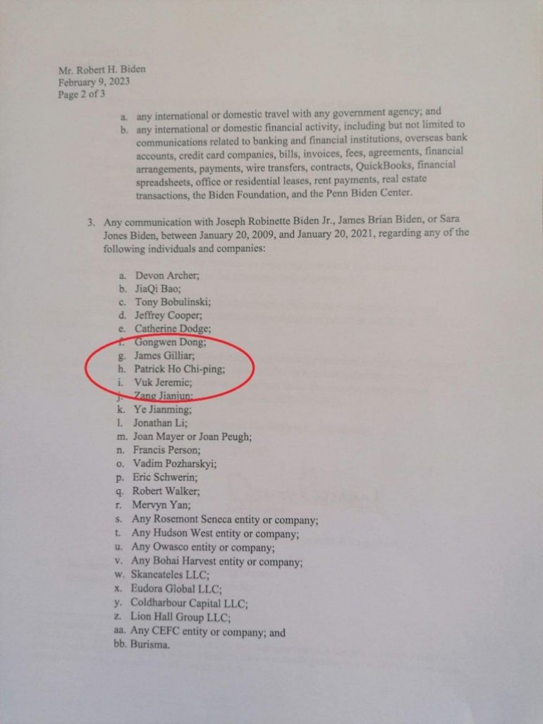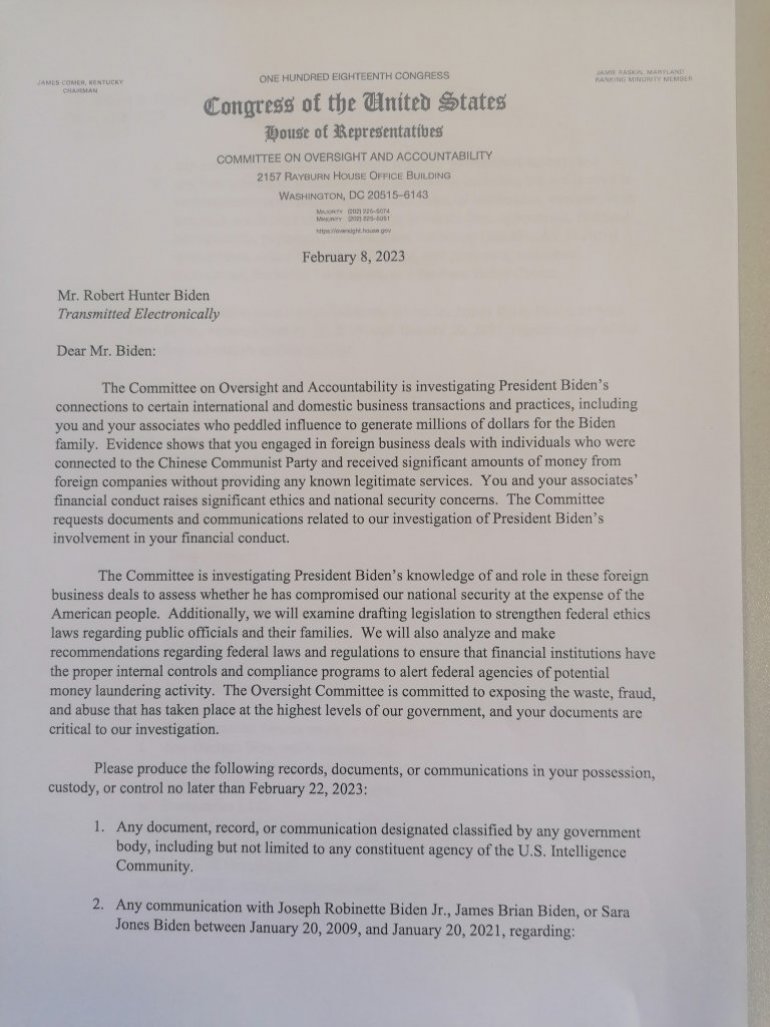 U dopisu koji je republikanski poslanik Komer poslao Bajdenu junioru 8. februara, a u koji su "Novosti" imale uvid, traži se da bude dostavljena sva dokumentacija u vezi sa kontaktima koji su sa navedenim licima i firmama ostvarena u periodu od 12 godina - od 20. januara 2009. do 20. januara 2021.