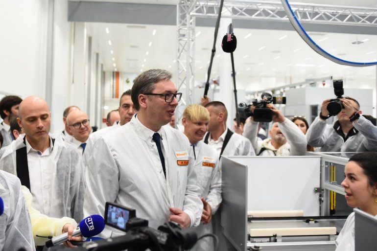 Predsednik obilazi fabriku i razgovara sa rukovodstvom. Vučić je prokomentarisao da fabrika super izgleda.