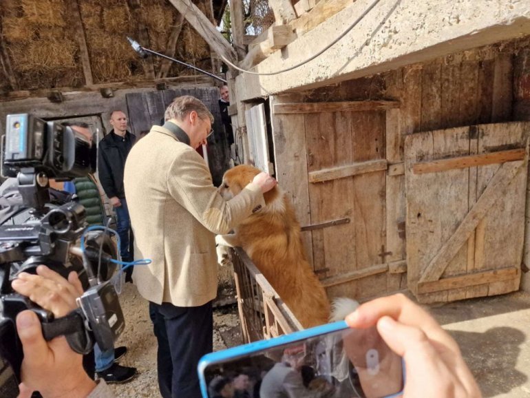 Predsednik je iskoristio priliku i da u štali Stamenkovića pomazi čuvara domaćinstva - Čupku.