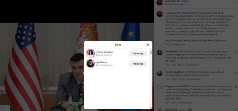 Zanimljivo je da je ovu objavu na Bastinom Instagram profilu podržao i njegov kolega iz Vlade i funkcioner SPS Đorđe Milićević. Međutim, svoj "lajk" aktuelni ministar bez portfelja munjevito je povukao.