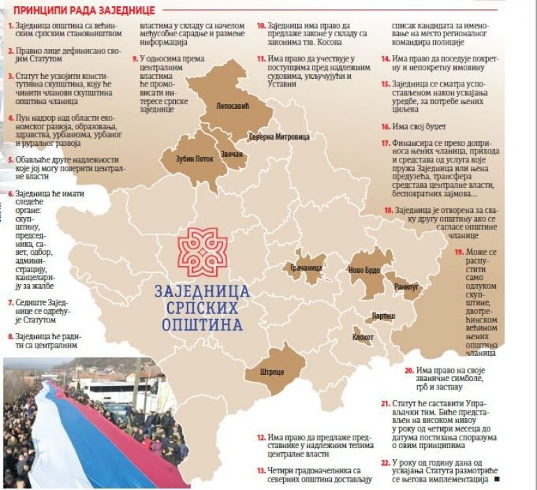 - Tači je prihvatio uspostavljanje ZSO, bez ugrožavanja funkcionisanja vlasti Prištine, a Dačić je insistirao na nepriznavanju Kosova. Dačić je bio spreman da ukloni paralelne strukture koje su delovale u opštinama sa srpskom većinom na severu Kosova, ali je tražio da Srbi dobiju garancije, da se lokalnom srpskom stanovništvu ponudi pravosudni sistem u koji bi mogli da veruju.