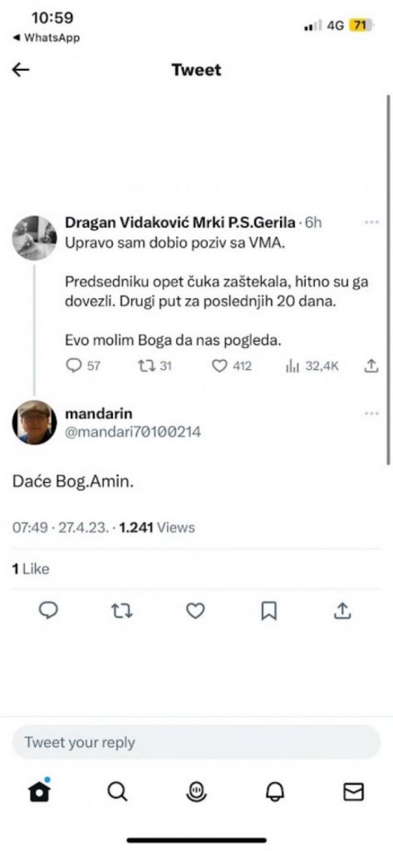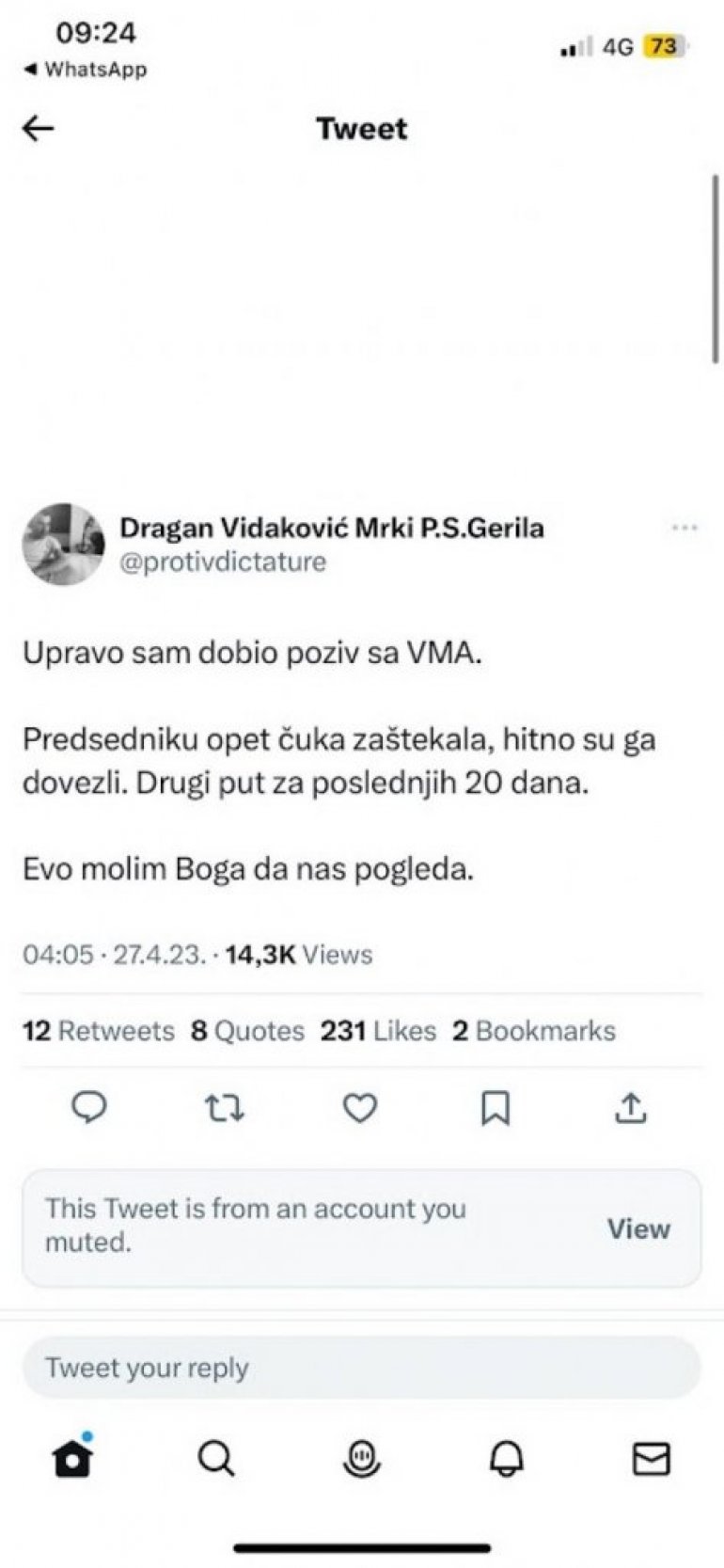 U objavi na društvenoj mreži Tviter, on plasira dezinformacije o zdravstvenom stanju Vučića, pozivajući se na izvore sa Vojnomedicinske akademije (VMA).