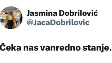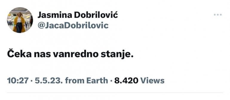 NOVINARKA "Nove S" Jasmina Dobrilović najavila je jutros na društvenim mrežama da Srbiju čeka vanredno stanje.