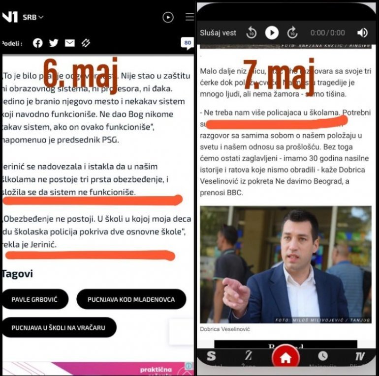 S druge strane njegova koleginica iz istog pokreta Jelena Jerinić izjavila je samo dan ranije da “u našim školama ne postoje tri prsta obezbeđenja, sistem ne funkcioniše".