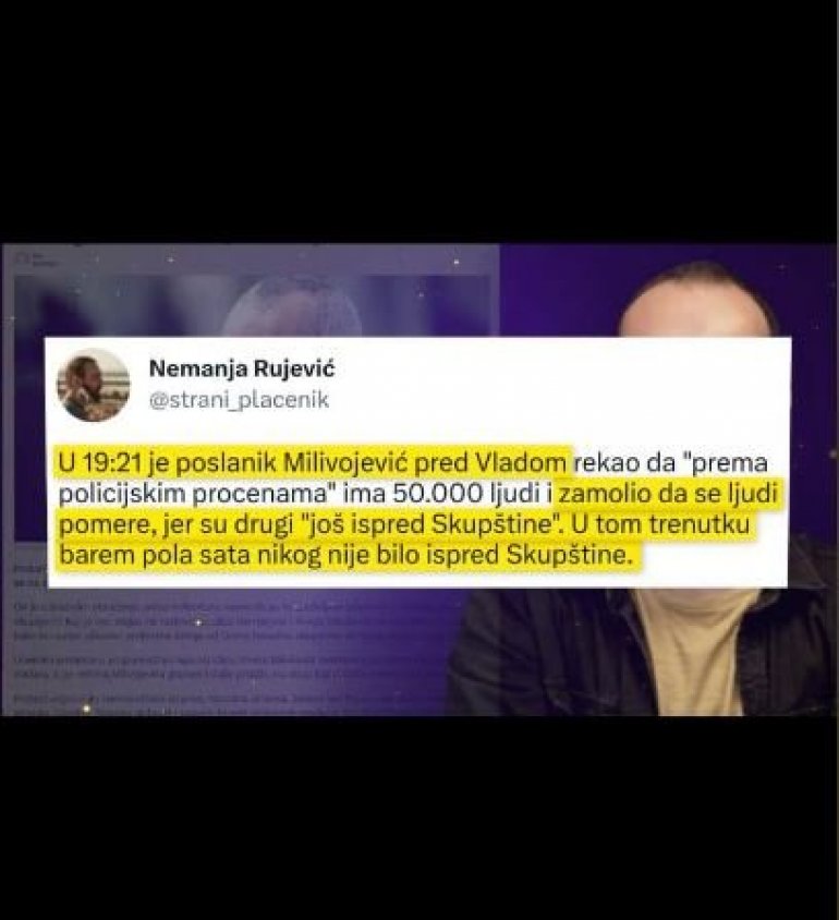 Njega je demantovao i Nemanja Rujević, novinar "Dojče velea", koji sam na Tviteru navodi da u trenutku kada je Milivojević rekao da se ljudi pomere, jer su navodno drugi "još ispred Skupštine", već pola sata ispred Parlamenta nije bilo nikoga: