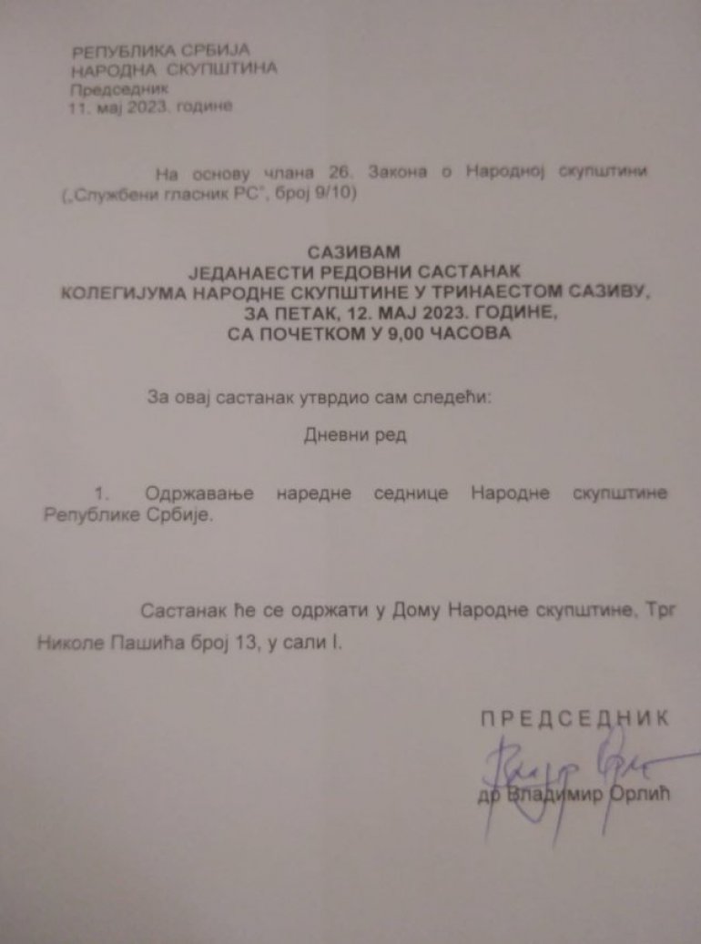 PREDSEDNIK Skupštine Srbije Vladimir Orlić sazvao je 11. redovni sastanak Kolegijuma Narodne skupštine za petak, 12. maj, sa početkom u 9 časova.