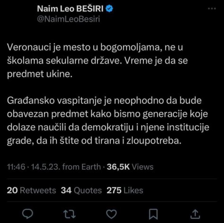 TRAŽI UKIDANJE VERONAUKE U ŠKOLAMA: Sinhronizovan napad na SPC i patrijarha - uključio se i Naim Leo Beširi