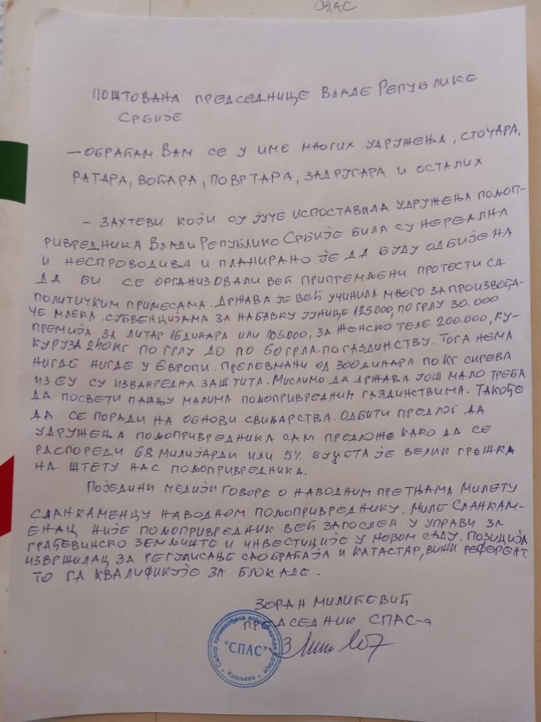 Poštovana predsednice Vlade Republike Srbije. Obraćam vam se u ime mnogih udruženja stočara, ratara, voćara, povrtara, zadrugara i ostalih.