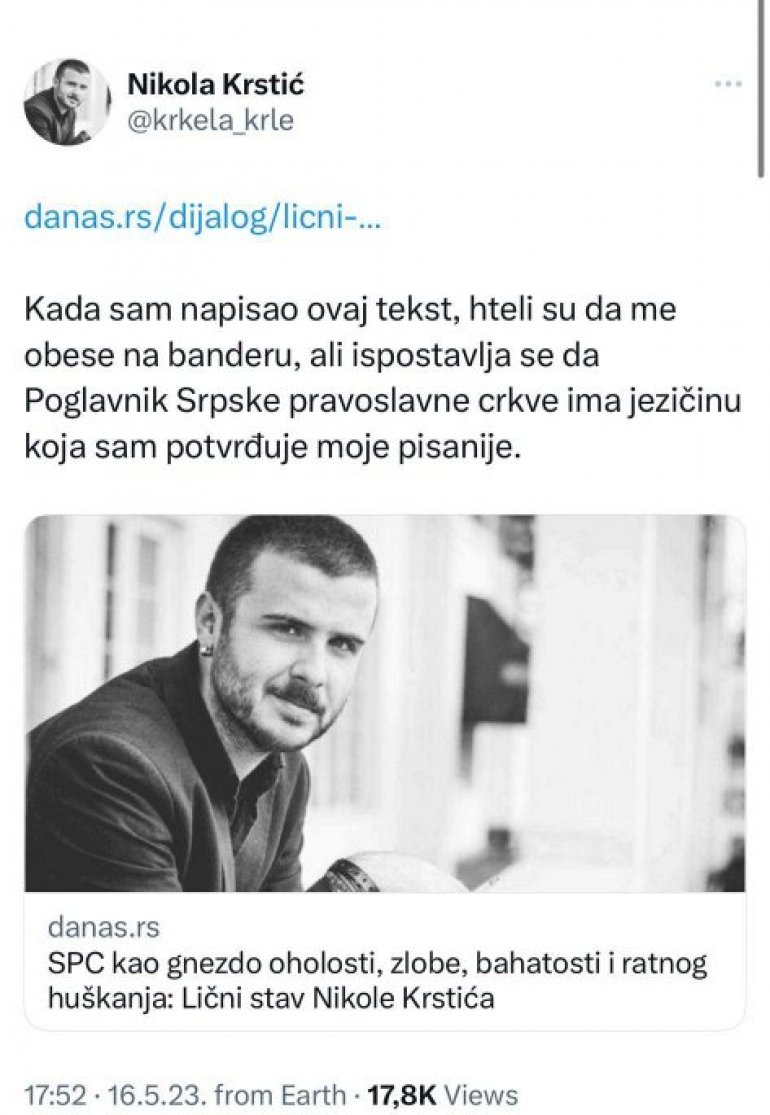 Naime, Krstić je u svojim gostovanjima i jednom od tekstova za list "Danas", patrijarha Porfirija uporedio sa Antom Pavelićem.