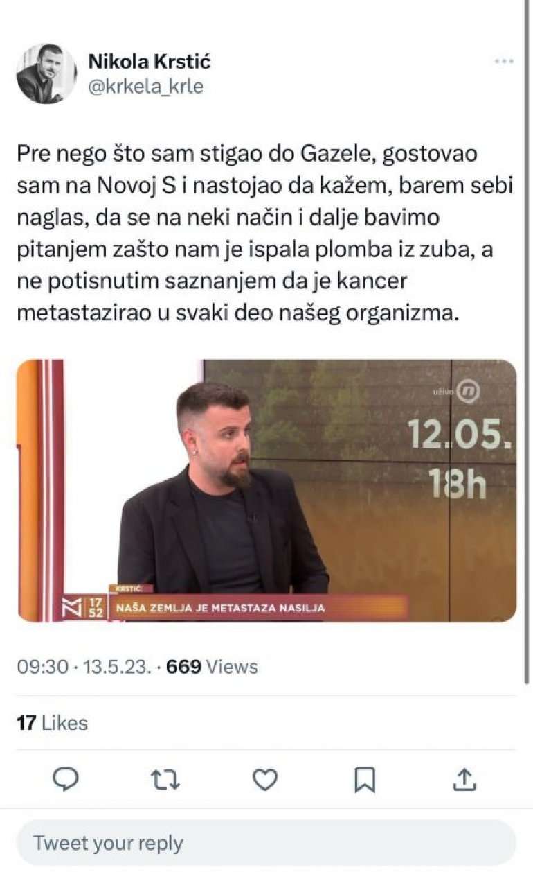 JEDAN od vodećih promotera blokada Gazele i državnih institucija koje organizuju predstavnici opozicije je i Nikola Krstić koji je napao patrijarha Porfirija i Srpsku pravoslavnu crkvu.